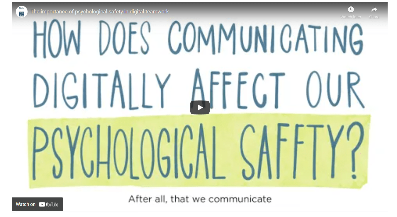 Da passet det bra at to av mine kolleger på NHH ville lage en minifilm av artikkelen min «Waiting for the host to start this meeting…» – Psykologisk trygghet i digitalt teamarbeid (Fyhn, 2020).