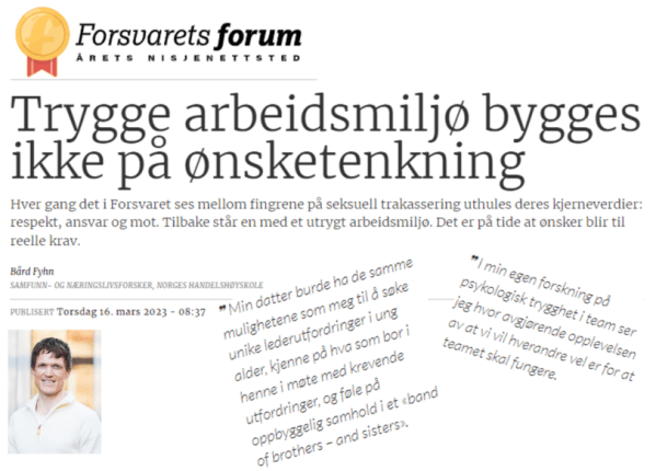 Færre enn før anbefaler kvinner å søke seg til Forsvaret ifølge en fersk undersøkelse. Det fikk meg til å tenke på om jeg ville anbefalt det til min egen datter. Det fikk meg også til å skrive en kronikk på temaet. Forsvaret ønsker å sette fokus på et trygt arbeidsmiljø for alle. Skal en tro... Fortsett lesing →