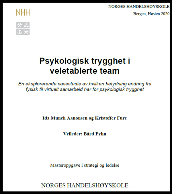 Gjennom det siste året har vi byttet samarbeidsform, fra fysisk til digitalt, og tilbake, og tilbake igjen... og sånn går no dagan. Hvilken betydning har dette hatt for vår psykologiske trygghet? Jeg hadde den glede av å veilede Ida Munch Aanonsen og Kristoffer Fure i deres masteroppgave høsten 2020. Her følger deres oppsummering av oppgaven.... Fortsett lesing →